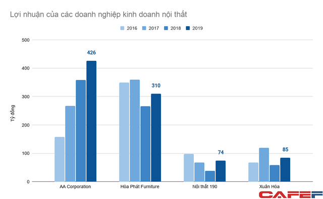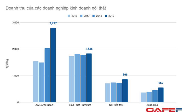Nhưng so với các doanh nghiệp có cùng cơ cấu sản phẩm như Nội thất Xuân Hòa và Nội thất 190 thì Nội thất Hòa Phát bỏ rất xa, doanh thu gấp 2 – 3 lần đối thủ, còn lợi nhuận thâm chí còn vượt trội hơn. Nội thất 190 năm ngoái doanh thu 866 tỷ đồng, lãi sau thuế 60 tỷ đồng. Xuân Hòa doanh thu 557 tỷ đồng, lãi 79 tỷ đồng.