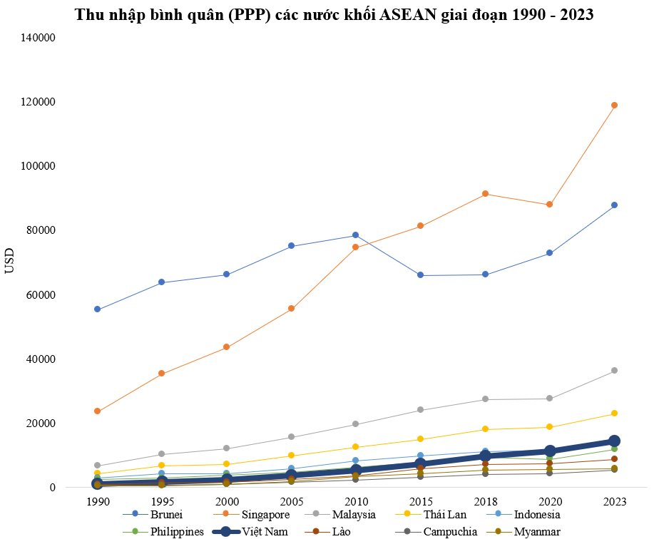 Sau 34 năm nỗ lực phát triển, thu nhập bình quân (PPP) của Việt Nam đã tăng từ 1.120 USD năm 1990 lên 14.400 USD năm 2023. Trong giai đoạn 1990 - 2023, thu nhập bình quân (PPP) của Việt Nam có mức tăng lớn thứ hai trong khối ASEAN (gấp gần 13 lần). Các quốc gia khác đều có sự cải thiện nhưng chậm hơn như: Lào (gấp hơn 8 lần), Campuchia (gấp hơn 7 lần), Malaysia (gấp hơn 5 lần), Thái Lan (gấp hơn 5 lần), Indonesia (gấp hơn 5 lần), Singapore (gấp hơn 5 lần), Philippines (gấp hơn 4 lần), Brunei (gấp 1,5 lần).