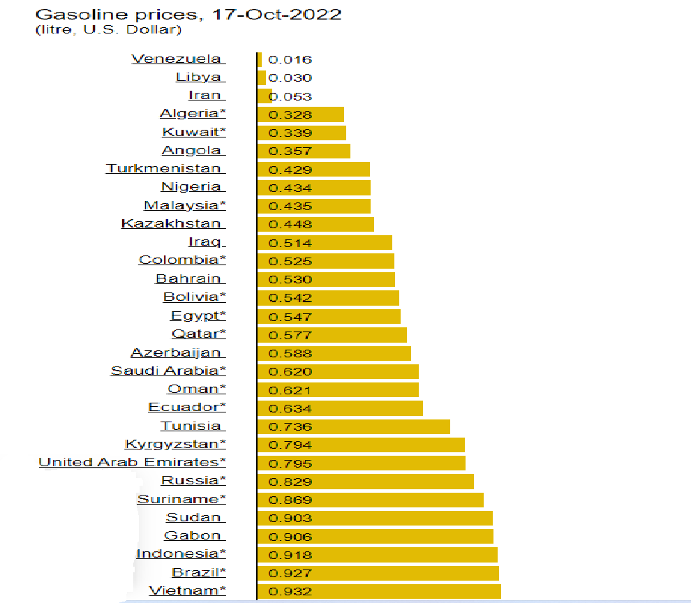 Theo đó, vẫn còn có tới 29 quốc gia/vùng lãnh thổ có giá xăng thấp hơn của Việt Nam. Malaysia cũng không phải là quốc gia có giá xăng thấp nhất thế giới dù nước này trợ giá mạnh mẽ cho năng lượng. Venezuela mới là quốc gia có giá xăng thấp nhất thế giới với giá chỉ bằng ly trà đá 0,016 USD/lít (tương đương gần 400 đồng/lít). Malaysia có giá xăng thấp thứ 9 thế giới. Còn giá xăng của Việt Nam trong bảng thống kê của Global Petrol Priceslà 0,932 USD/lít (khoảng hơn 23.100 đồng/lít), đứng thứ 30 trong số các nền kinh tế có giá xăng thấp nhất thế giới.
