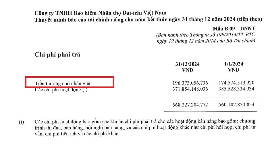 Tuy nhiên, chi phí lương trong báo cáo tài chính của Dai-ichi Life lại được phân bổ ở nhiều mục khác nhau như: “Chi phí phải trả”, “Chi phí bán hàng”, thay vì tập trung ở mục “Chi phí quản lý doanh nghiệp” như một số công ty bảo hiểm khác. Điều này khiến con số thu nhập bình quân có thể không phản ánh đầy đủ thực tế.