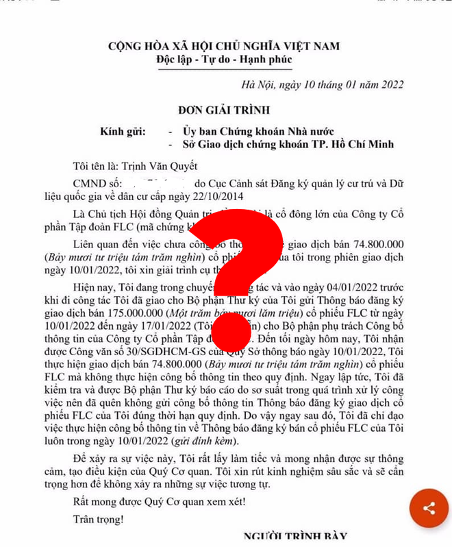 Ghi nhận trên Doanh Nghiệp & Tiếp Thị, sáng ngày 11/01, mạng xã hội, các room chat chứng khoán đang lan truyền nhau một văn bản được cho là giải trình của Chủ tịch Tập đoàn FLC Trịnh Văn Quyết về việc bán chui gần 75 triệu cổ phiếu FLC.