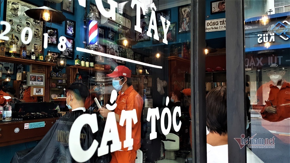 6h30 sáng, tiệm cắt tóc Đông Tây Barber Shop (quận Phú Nhuận) đã mở cửa đón những vị khách đầu tiên, sau thời gian nghỉ dài do giãn cách xã hội. Đến 9h, nhân viên tại quán liên tục phải xin lỗi và mời khách mới đến quay lại sau do lượng khách xếp hàng chờ đã quá đông.