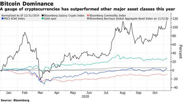 Bloomberg Galaxy Crypto Index, một thước đo giá của các đồng tiền kỹ thuật số trong đó có Bitcoin, đã tăng 120% từ đầu năm, vượt xa mức tăng 30% của loại tài sản có mức lãi cao thứ nhì là vàng.