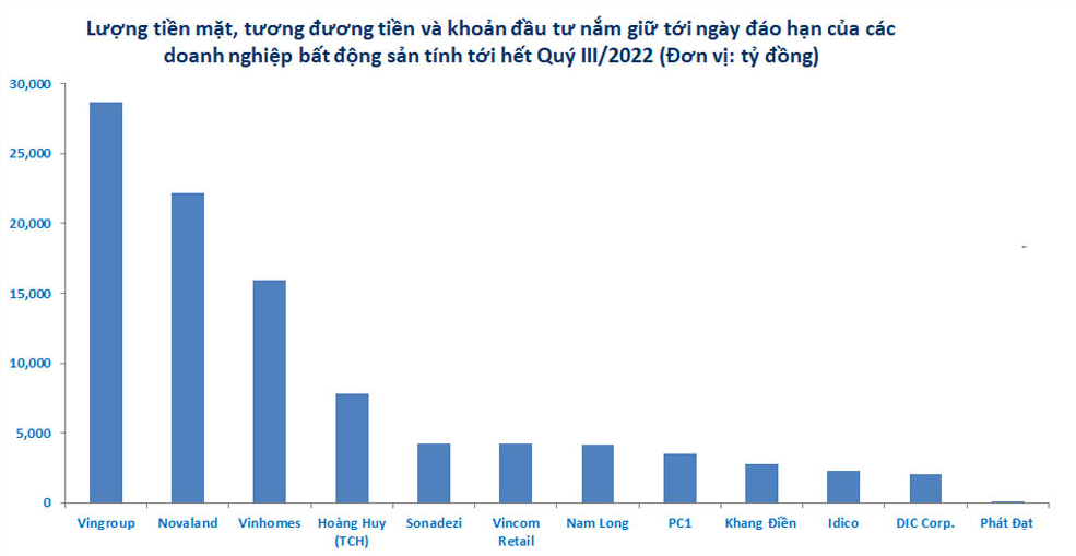 Ngoài Vingroup và Vinhomes, một số doanh nghiệp BĐS có lượng tiền lớn như Novaland (22.200 tỷ đồng), Sonadezi (4.260 tỷ đồng), Nam Long (4.178 tỷ đồng), Khang Điền (2.755 tỷ đồng), DIC Corp. (2.060 tỷ đồng),...