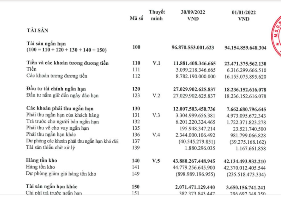 Tới cuối quý III/2022, Tập đoàn Hòa Phát (HPG) của tỷ phú Trần Đình Long nắm giữ lượng tiền 38.911 tỷ đồng, trong đó có 27.030 tỷ đồng gửi gửi ngân hàng và 11.881 tỷ đồng tiền và tương đương tiền.