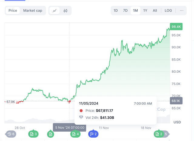 Sáng 24-11, Bitcoin giao dịch ở mức vượt 98.000 USD, tăng chóng mặt so với mốc hơn 42.000 USD hồi đầu năm. Đặc biệt, chỉ hơn 2 tuần từ thời điểm mốc 5-11, ông Donald Trump đắc cử Tổng thống Mỹ, đồng tiền số này đã nhảy vọt từ vùng 67.000 USD lên mốc cao chót vót hiện tại.