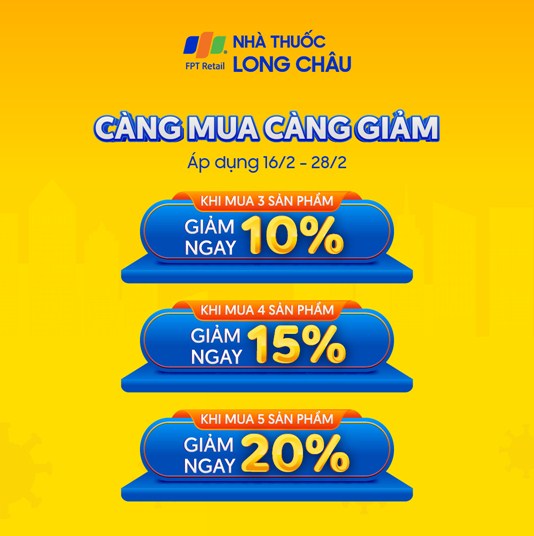 Hiểu được những khó khăn của người bệnh và mong muốn chia sẻ gánh nặng tài chính, giúp họ mau chóng hồi phục, FPT Long Châu đã thiết kế chương trình khuyến mãi Giảm nhiều hơn cho khách hàng khi mua 3, hoặc 4, hoặc 5 món hàng tại nhà thuốc, đặc biệt là sản phẩm hỗ trợ phục hồi sau Covid. Khách hàng có cơ hội giảm ngay 20% giá trị đơn hàng và giảm thêm 10% khi thanh toán bằng VNPayQR. Việc này nhằm giúp người dân tiếp cận thuốc tốt với giá tốt nhất có thể.