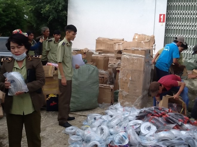 | Cán bộ Chi cục Quản lý thị trường Bình Định kiểm đếm hàng nhập lậu trước khi tiêu hủy. Ảnh: Duc Tien. |