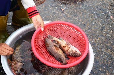 Cá mú tươi sống do ngư dân đánh bắt về để trong chậu cũng không bán được. Ngày thường, loại cá đặc sản này có giá 200.000-300.000 đồng/kg nhưng giờ bán chưa đến 100.000 đồng vẫn không có người mua. |