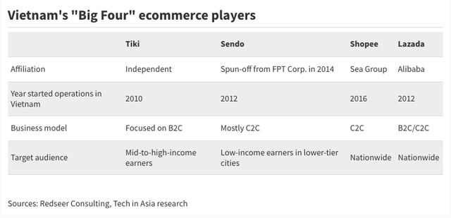 Shopee – đơn vị vào Việt Nam từ năm 2016 là một trong "Big 4" của thị trường thương mại điện tử ở đây. Chi nhánh của tập đoàn Sea đã nhanh chóng chiếm được thị trường xét về lượng người dùng web và di động.
