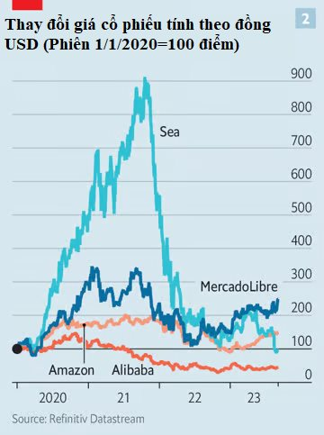 Thương hiệu Shopee vốn chiếm một nửa tổng GMV 100 tỷ USD tại Đông Nam Á năm 2022 thì đang phải chứng kiến 2 quý liên tiếp gần đây sụt giảm doanh số. Tổng giá trị thị trường của công ty mẹ Sea Group giờ chỉ còn 1/10 so với thời đỉnh cao 200 tỷ USD năm 2021.