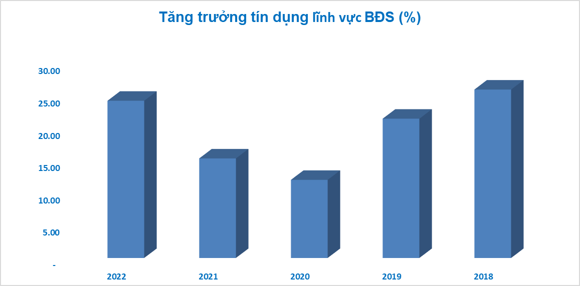 Theo số liệu của NHNN, đến cuối năm 2022, dư nợ cho vay lĩnh vực BĐS đạt hơn 2,58 triệu tỷ đồng, tăng 24,27% so với cuối năm 2021 (cao hơn mức tăng 14,5% tín dụng chung toàn ngành ngân hàng).