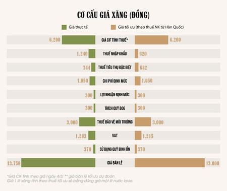 Nếu tính theo mức thuế nhập khẩu từ Hàn Quốc, giá cơ sở của xăng sẽ thấp hơn hiện nay khoảng 700 đồng. Khi đó, giá bán lẻ có thể chỉ là 13.000 đồng thay vì 13.750 đồng mỗi lít.