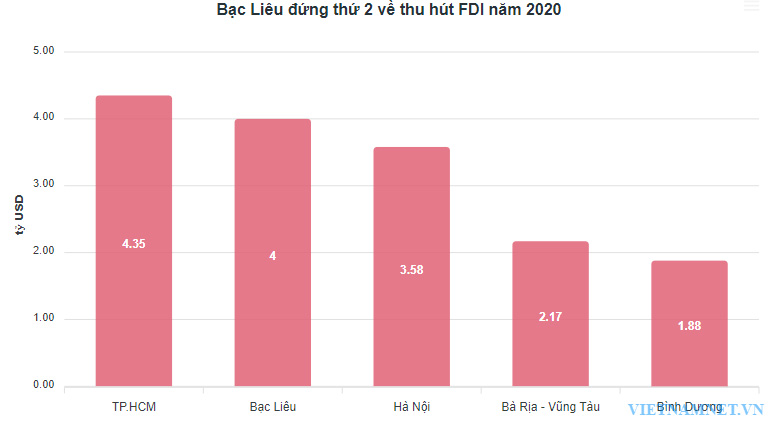 Năm 2020, số liệu của Cục Đầu tư nước ngoài ghi nhận Bạc Liêu đứng thứ 2 trong số các tỉnh/thành thu hút được nhiều vốn đầu tư nước ngoài nhất. Chỉ với 1 dự án đăng ký đầu tư với số vốn lên tới 4 tỷ USD, Bạc Liêu đã lọt top thu hút FDI. Đó là trường hợp dự án điện khí tự nhiên hóa lỏng (LNG) Bạc Liêu của Công ty Delta Offshore Energy.