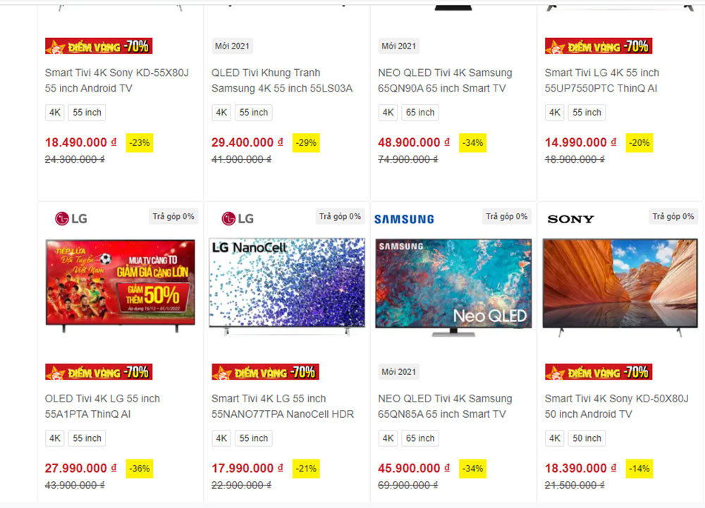 Tại website của một số hệ thống siêu thị điện máy có tiếng trên thị trường nhiều mẫu tivi của các thương hiệu tên tuổi như Samsung, LG, Sony, Panasonic, TCL,... từ hàng bình dân đến cao cấp, đều được giảm giá rất mạnh. Có nhiều mẫu smart tivi từ 49-65 inch với độ phân giải 4K được giảm giá mạnh, có nhiều mẫu được giảm giá tới gần 50%.