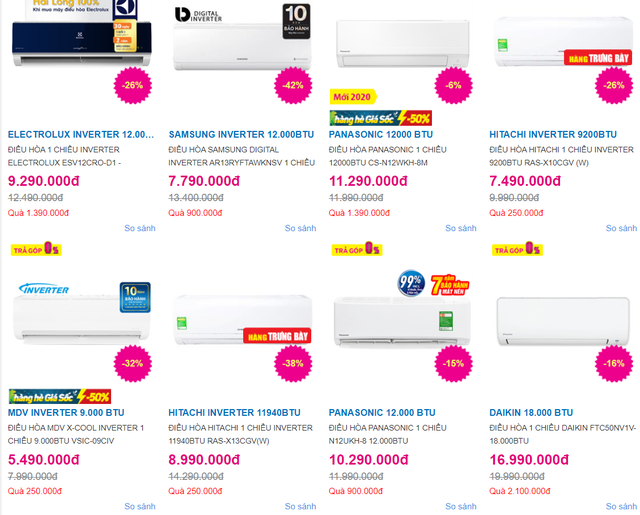 "Điều hòa 1 chiều Samsung Digital Inverter AR13RYFTAWKNSV công suất 12.000 BTU đang được giảm giá 42%, đưa mức giá từ 13,4 triệu đồng xuống còn hơn 7,7 triệu đồng. Điều hòa Electrolux ESV12CRO-D1 hiện được giảm giá giảm giá từ 26% giá xuống còn 9,2 triệu đồng. Điều hòa MDV INVERTER 9.000 BTU được ưu đãi 32% chi phí còn 5,4 triệu đồng..."