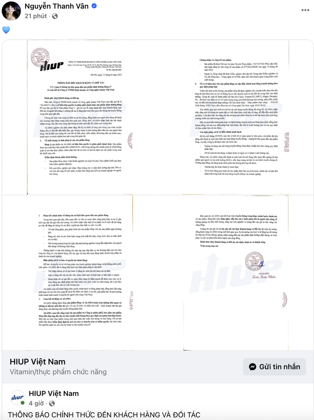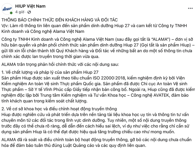 Mới đây, công ty TNHH Kinh doanh và Công nghệ Alama Việt Nam (gọi tắt: ALAMA) đã lên tiếng về sự việc trên trang fanpage chính thức của sản phẩm HIUP.