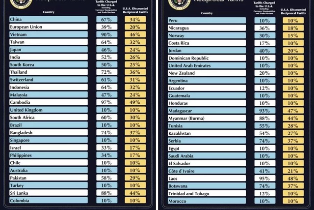 Mức thuế mới của Mỹ đối với một số quốc gia, khu vực gồm có: Trung Quốc (34%), Liên minh châu Âu (20%), Nhật Bản (24%), Hàn Quốc (25%), Thụy Sĩ (31%), Anh (10%), Malaysia (24%), Ấn Độ (26%), Brazil (10%), Indonesia (32%), Việt Nam (46%), Singapore (10%), Ukraine (10%), Venezuela (15%).Trên chiếc bảng công bố mức thuế, một trong những mức thuế quan cao nhất là 49% sẽ được áp dụng đối với tất cả hàng nhập khẩu của Campuchia.
