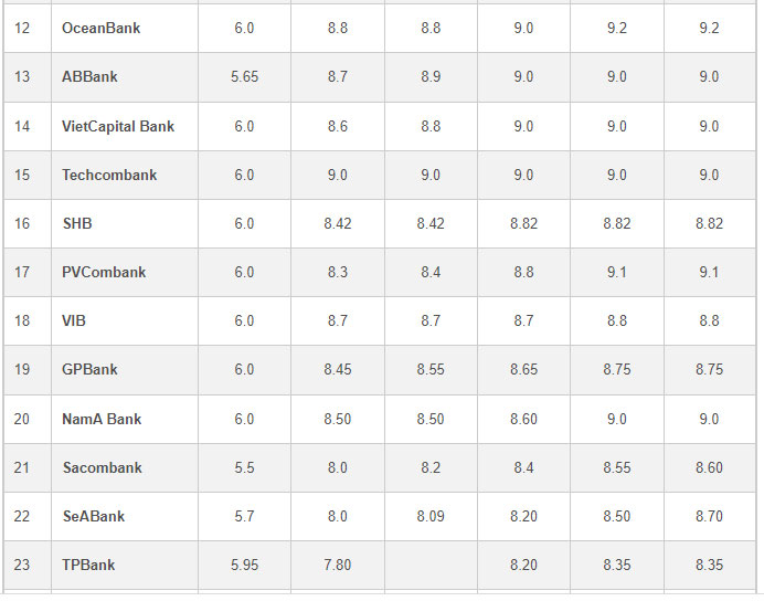 Theo thống kê của VietNamNet tại ngày 15/2, lãi suất huy động kỳ hạn 1-5 tháng được hầu hết các ngân hàng công bố mức 6%. Tuy nhiên, sự khác biệt xuất hiện ở kỳ hạn 6 tháng, với mức cao nhất thuộc về SCB và HDBank, lên tới 9,5%/năm.