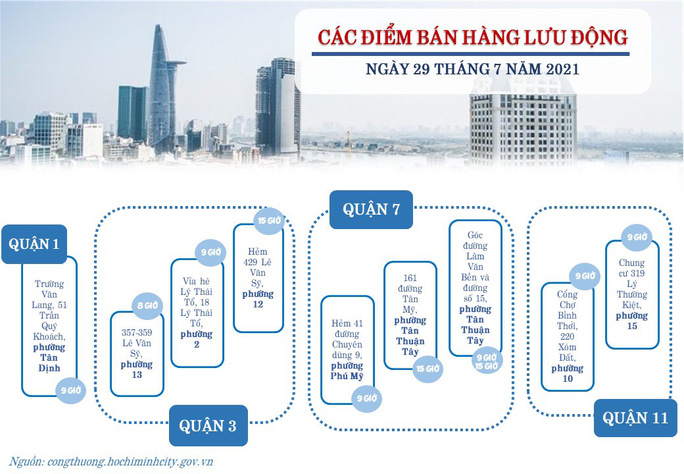 Trong ngày 27-7, Sở Công Thương TP HCM đã bố trí được 24 điểm bán hàng lưu động với 38 lượt xe. Lũy kế từ ngày 11 đến ngày 27-7, sở đã tổ chức 362 điểm bán lưu động với 513 lượt xe (1 điểm bán có thể bố trí 1 - 2 xe theo nhu cầu sản phẩm của người dân), phân bổ theo nhu cầu của các quận, huyện, TP Thủ Đức, cung cấp hơn 215 tấn hàng hóa và 292.000 quả trứng cho người dân tại những nơi xe bán hàng lưu động đến hoạt động.
