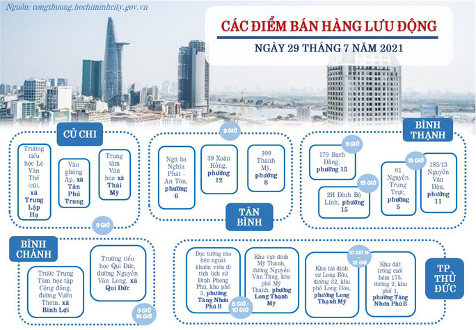 Còn trên tài khoản facebook "Đoàn Sở Công Thương TP HCM", danh sách các điểm bán hàng lưu động được trình bày theo dạng sơ đồ, mỗi quận, huyện là 1 khung với những thông tin cần thiết cho người dân dễ nhìn thấy nhất.