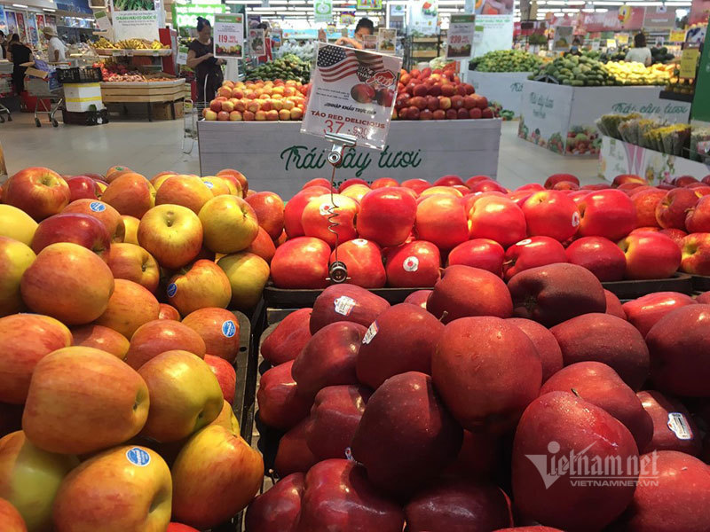 Tương tự, tại các hệ thống siêu thị lớn ở Hà Nội, trái cây nhập khẩu cũng chất đống với giá rất rẻ. Như táo Red Delicious Mỹ giá chỉ 39.000 đồng/kg; táo Fuji Hàn 70.000 đồng/kg, giảm 30.000 đồng/kg; táo Braeburn nhập khẩu New Zealand giá 50.000 đồng/kg; giá việt quất Mỹ cũng giảm 89.000 đồng, xuống còn 55.000 đồng/hộp 125gram,...