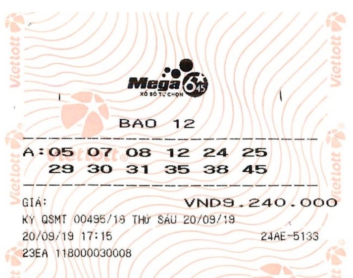 Trước đó, Chi nhánh Khánh Hòa đã tiếp nhận chiếc vé xổ số tự chọn Mega 6/45 từ anh V.Đ. Qua kiểm tra trên hệ thống kỹ thuật và hồ sơ kèm theo, Vietlott xác định đây là 1 trong 2 chiếc vé đã trúng giải Jackpot sản phẩm Mega 6/45 kỳ QSMT thứ 495 ngày 20/9/2019. Tuy nhiên, anh V.Đ mua vé Bao 12 nên anh sẽ nhận thưởng 50.166.002.250 đồng (chưa khấu trừ thuế thu nhập cá nhân theo quy định nhà nước), nhiều hơn chị Đ.T.T - vị khách may mắn trúng thưởng cùng trúng thưởng Jackpot (nhận thưởng 49,7 tỷ đồng).