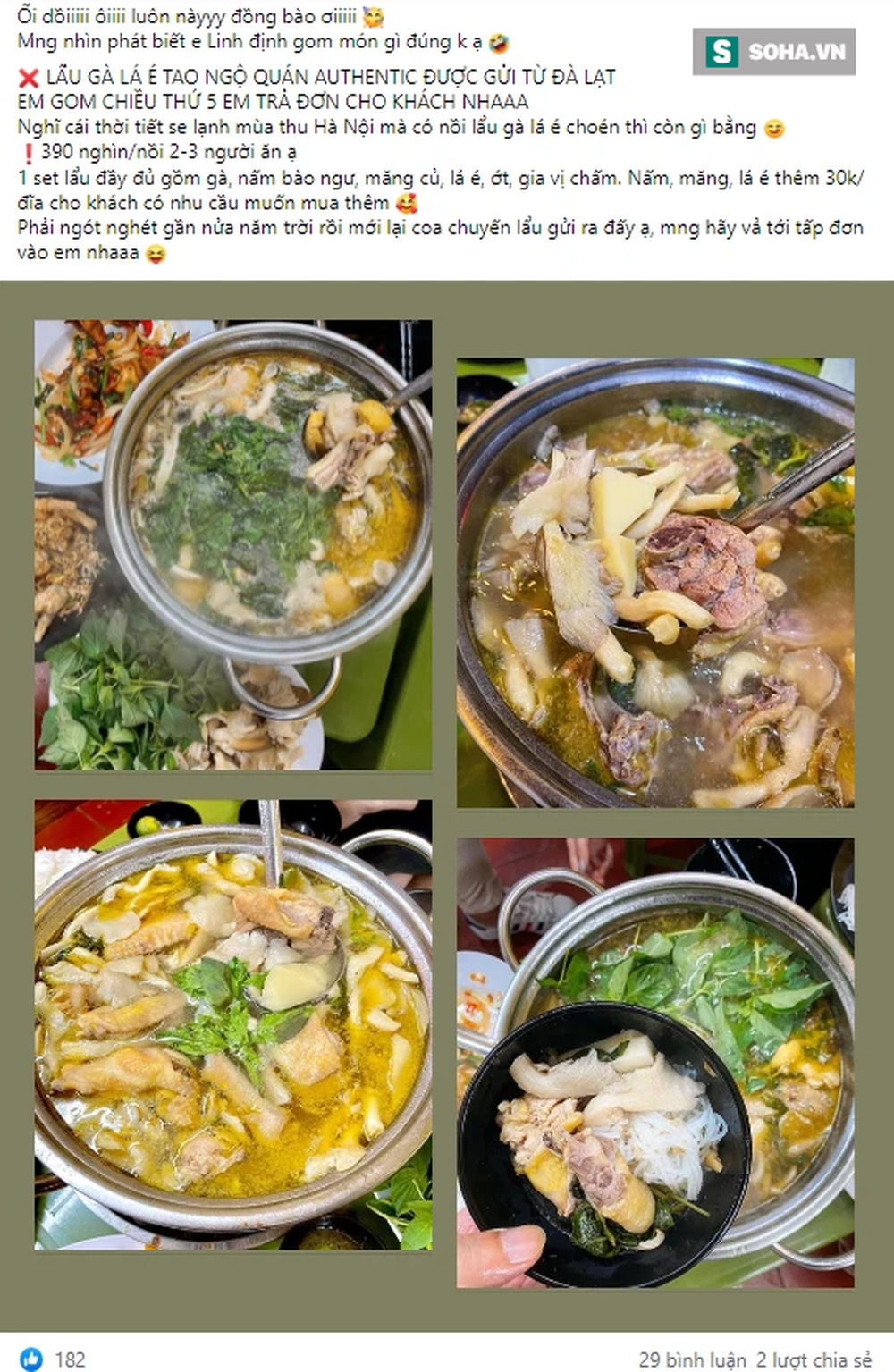 Có cung ắt có cầu, những ngày này, khắp các diễn đàn và chợ mạng lại tấp nập rao bán lẩu gà lá é. Người bán combo cả nồi lẩu từ nước lẩu, gà, rau lá é, ớt xiêm, khách về chỉ việc bật bếp lên để thưởng thức. Những bài đăng bán set lẩu gà lá é được chốt đơn ầm ầm từ thực khách.