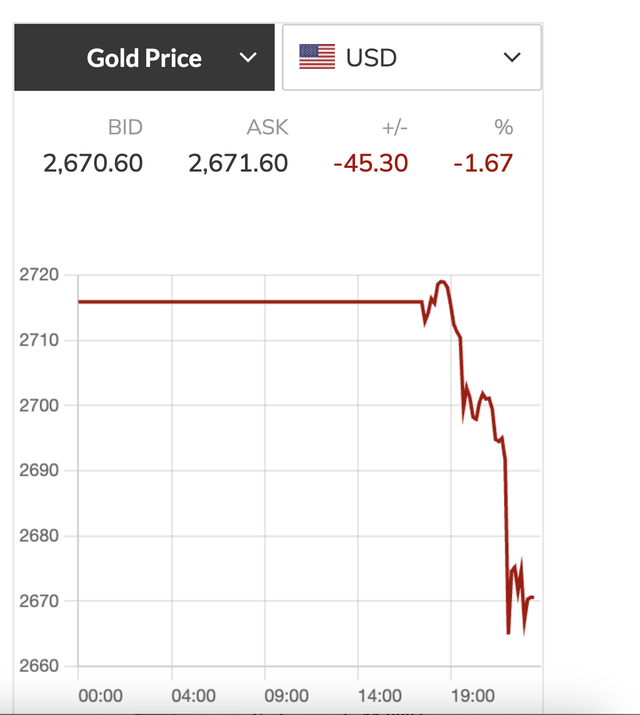 Giá vàng trong nước đi xuống trong bối cảnh giá thế giới "rơi tự do". Lúc 11 giờ 30, theo giờ Việt Nam, giá vàng hôm nay trên thị trường quốc tế biến động dữ dội, giảm về chỉ còn 2.674 USD/ounce, rớt mạnh khoảng 45 USD/ounce (tương đương mức giảm khoảng 1,3 triệu đồng/lượng).