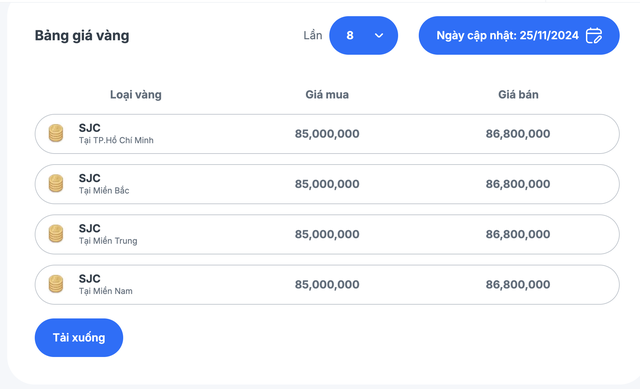 Trưa 25-11, sau vài giờ neo giá, công ty SJC điều chỉnh giảm giá vàng miếng SJC xuống còn 84,8 triệu đồng/lượng mua vào, 86,8 triệu đồng/lượng bán ra, giảm 200.000 đồng mỗi lượng so với đầu ngày. Đây là lần giảm giá đầu tiên của giá vàng trong 1 tuần qua.