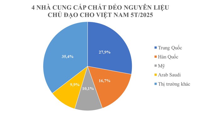 Xét về thị trường, Trung Quốc tiếp tục là nhà cung cấp nguyên liệu nhựa cho Việt Nam 5 tháng đầu năm 2025 khi chiếm gần 28% thị phần, đạt hơn 1,08 triệu tấn, tương đương 1,53 tỷ USD, tăng 34,1% về lượng và tăng 26,2% về trị giá so với cùng kỳ năm 2024. Giá bình quân đạt 1.415 USD/tấn, giảm 5% s với 5 tháng đầu năm 2024.