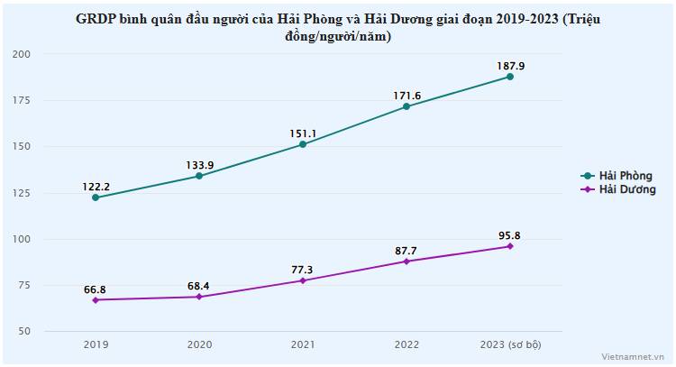 GRDP bình quân đầu người của Hải Phòng cũng tăng mạnh, từ 122,2 triệu đồng năm 2019 lên 187,9 đồng/người/năm vào năm 2023. Giai đoạn 2019-2023, GRDP bình quân đầu người của thành phố này tăng trung bình 13,14 triệu đồng/người/năm.