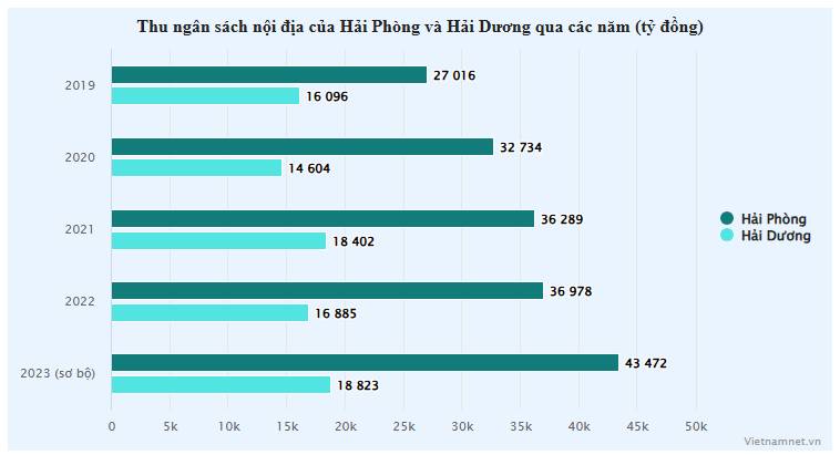 Về thu ngân sách nội địa của Hải Phòng, số liệu thống kê cho thấy, năm 2023 đạt gần 43.472 tỷ đồng, gấp 1,6 lần con số 27.016 tỷ đồng của năm 2019.