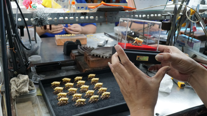Trong khi đó, ngoài các sản phẩm vàng Thần Tài có giá bán từ 3-5 triệu đồng/món, hệ thống tiệm vàng Mi Hồng ở TP HCM còn hướng tới khách hàng có thu nhập trung bình qua việc chào bán các con trâu vàng có trọng lượng từ vài phân đến 1 chỉ vàng.