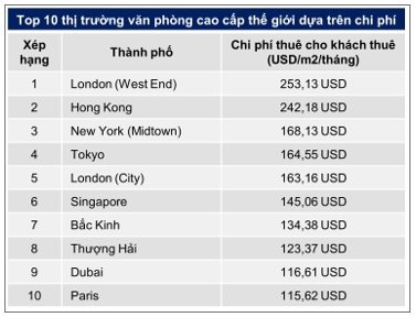 Theo báo cáo này, London (West End) là khu vực dẫn đầu danh sách các thị trường có giá thuê văn phòng cao nhất thế giới với giá thuê trung bình của văn phòng cao cấp đạt 253,13 USD/m2/tháng.