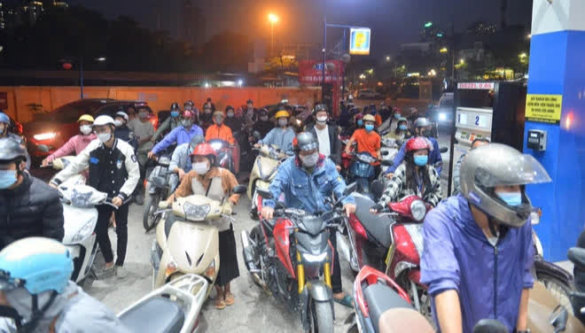 Tại một cửa hàng xăng dầu ở quận Nam Từ Liêm (Hà Nội) có rất đông người dân tranh thủ đi đổ xăng sau khi nghe tin tăng giá. Một số người dân mang theo can, chai để mua thêm xăng tích trữ trước thời điểm tăng giá.