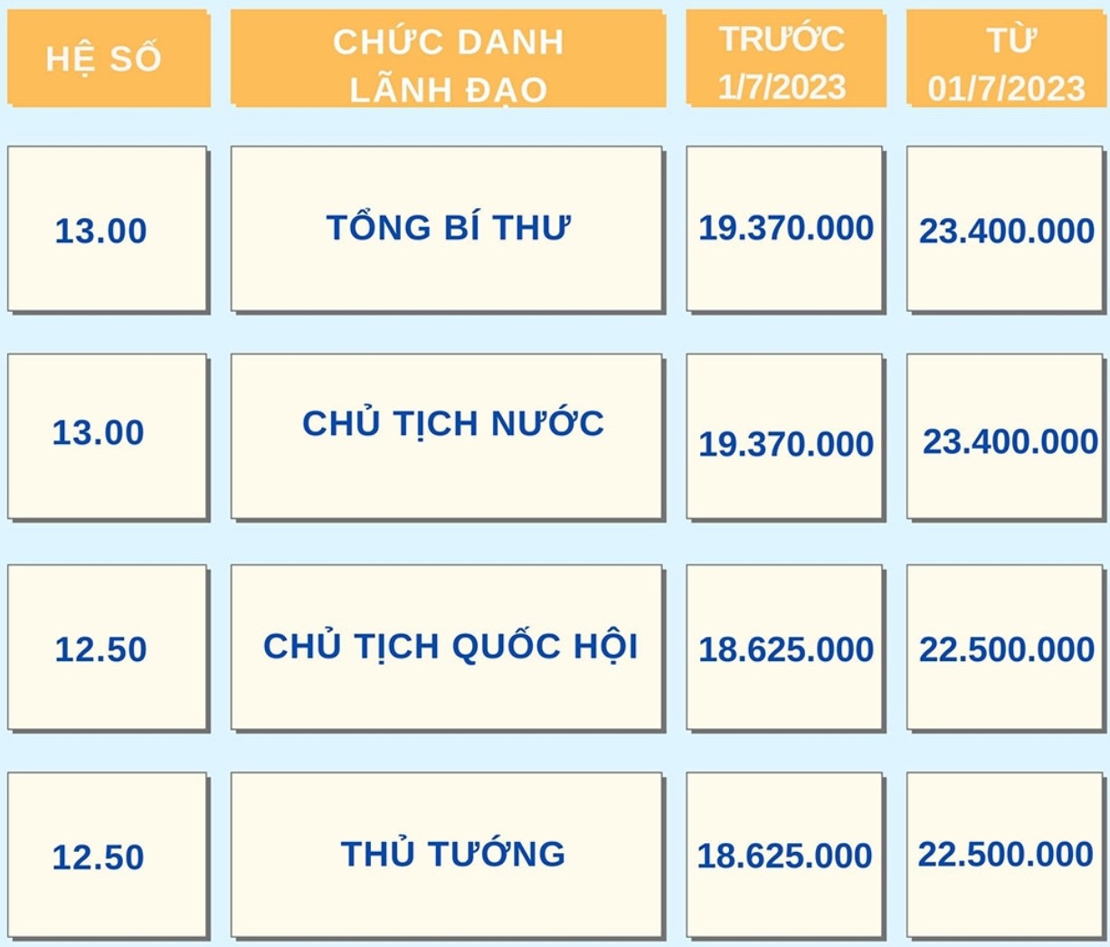 Căn cứ theo mức thay đổi trên, từ ngày 01/7/2023, đối với chức danh Tổng Bí thư và Chủ tịch nước thì tiền lương sẽ tăng từ 19,370 triệu đồng lên 23,4 triệu đồng/tháng.