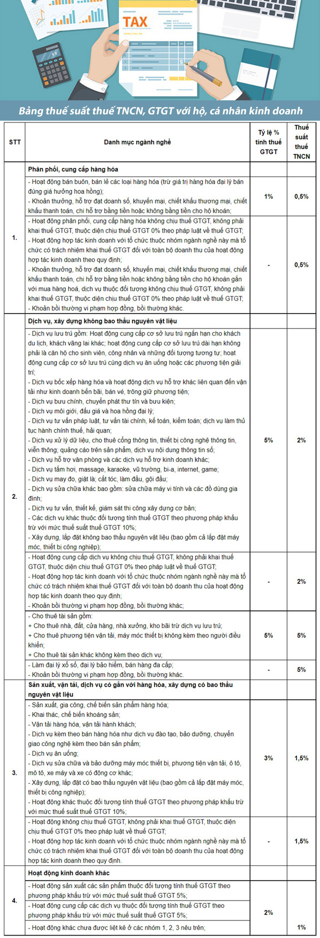 Theo đó, Bộ Tài chính đã công bố danh mục ngành nghề tính thuế GTGT và thuế TNCN theo tỷ lệ phần trăm trên doanh thu đối với từng nhóm hộ kinh doanh, cá nhân kinh doanh cụ thể.