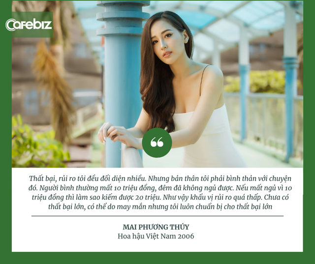 Nói về việc đối diện rủi ro trong đầu tư chứng khoán, Thúy chia sẻ: "Thất bại, rủi ro tôi đều đối diện nhiều. Nhưng bản thân tôi phải bình thản với chuyện đó. Người bình thường mất 10 triệu đồng, đêm đã không ngủ được. Nếu mất ngủ vì 10 triệu đồng thì làm sao kiếm được 20 triệu. Như vậy khẩu vị rủi ro quá thấp. Chưa có thất bại lớn, có thể do may mắn nhưng tôi luôn chuẩn bị cho thất bại lớn".