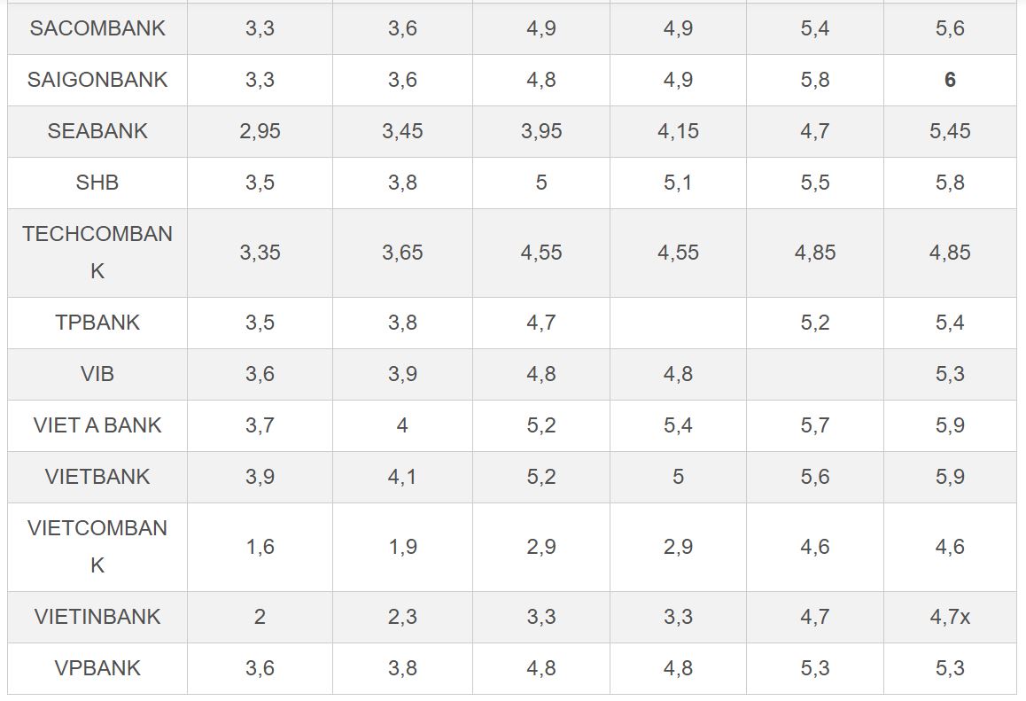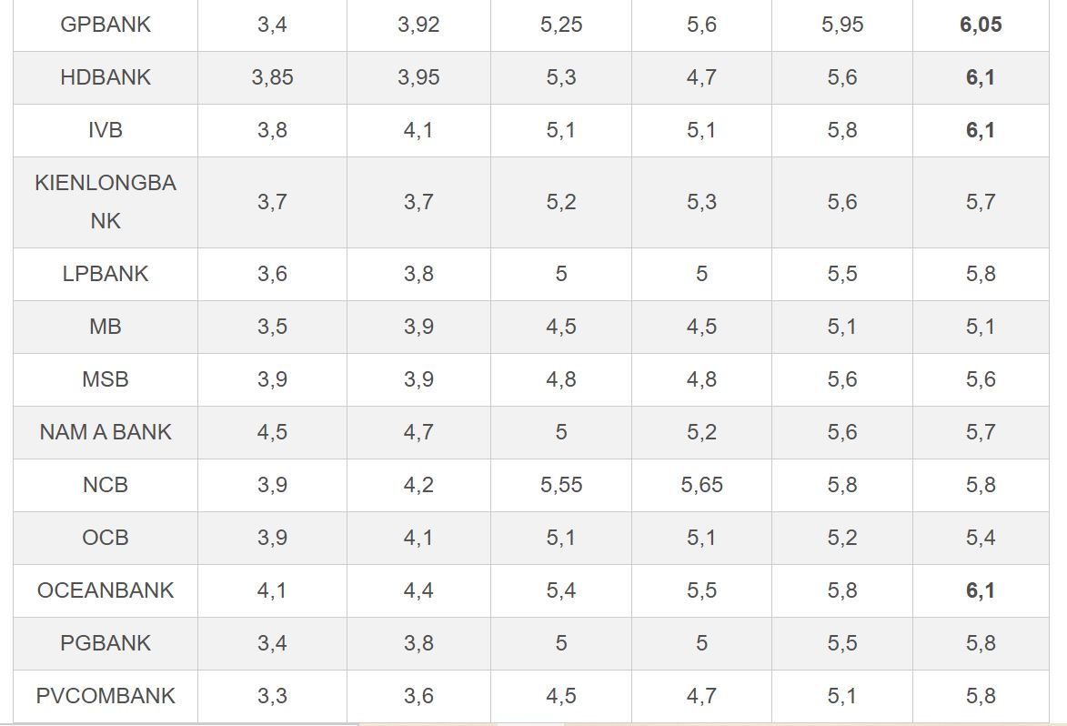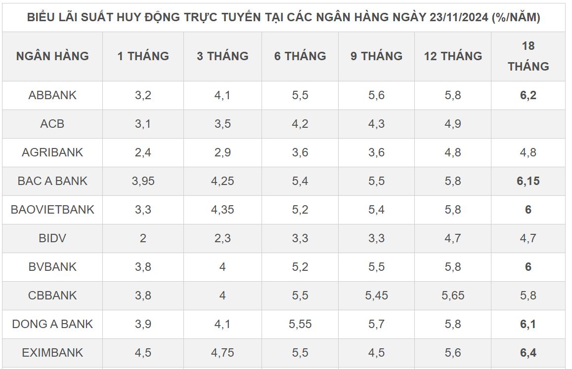 Lãi suất ngân hàng khi gửi tiền trực tuyến (lĩnh lãi cuối kỳ) vào các ngày làm việc trong tuần vẫn được giữ nguyên như sau: Kỳ hạn 1 tháng 3,9%/năm, kỳ hạn 2 tháng 4%/năm, kỳ hạn 3 tháng 4,3%/năm, kỳ hạn 4 tháng 4,7%/năm, kỳ hạn 5 tháng 3,9%/năm, kỳ hạn 6 tháng 5,2%/năm, kỳ hạn 9 tháng 4,5%/năm, kỳ hạn 12 tháng 5,2%/năm, kỳ hạn 15 tháng 5,7%/năm, kỳ hạn 18 tháng 5,8%/năm, kỳ hạn 24 tháng 5,9%/năm, và kỳ hạn 36 tháng 5,2%/năm.