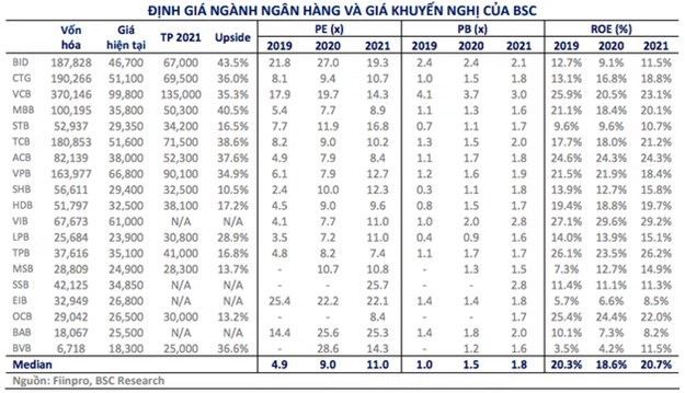 Đồng quan điểm với VDSC thậm chí có phần lạc quan hơn nhiều, CTCK BSC đã đưa ra dự phóng đầy tham vọng đối với các cổ phiếu ngân hàng ngay trước nhịp điều chỉnh. Theo đó, CTCK này đã nâng định giá các cổ phiếu ngân hàng trong năm 2021 lên mức khá cao có thể kể đến như VCB (135.000 đồng/cổ phiếu), CTG (69.500 đồng/cổ phiếu), TCB (71.500 đồng/cổ phiếu), VPB (90.100 đồng/cổ phiếu),…
