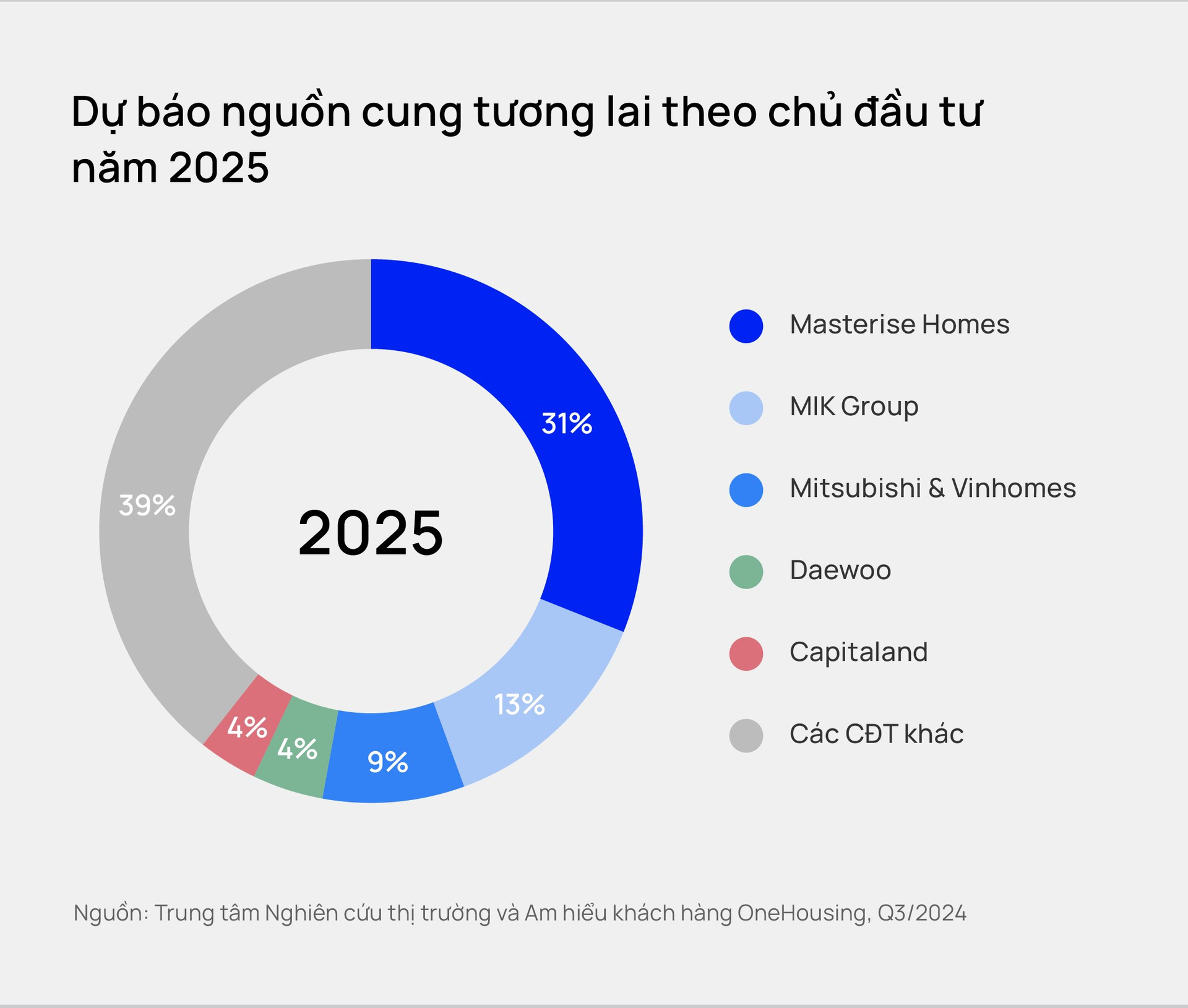 Bên cạnh đó, trong năm 2025, thị trường cũng sẽ chứng kiến những thay đổi rõ rệt về nguồn cung từ các chủ đầu tư. OneHousing dự báo trong năm 2025, gần 1/3 nguồn cung toàn thị trường Hà Nội sẽ thuộc về Masterise Homes.