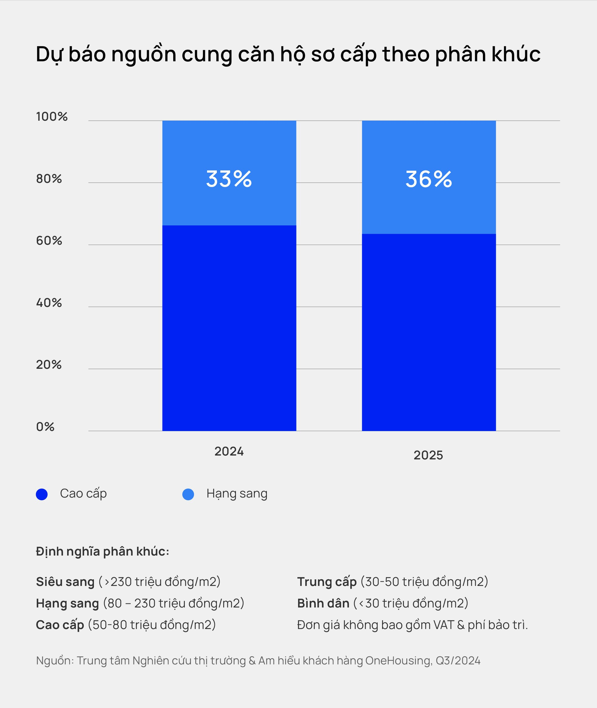 Theo chuyên gia, thị trường căn hộ Hà Nội đang đi theo đúng kịch bản tăng trưởng của TP. Hồ Chí Minh. Trong 2-3 năm tới, thị trường bất động sản sẽ trở nên rõ ràng hơn với những thay đổi đáng kể, bao gồm biến động giá và sự điều chỉnh về nhu cầu của cả nhà đầu tư lẫn người mua để ở. Dự báo toàn bộ nguồn cung sơ cấp tại Hà Nội trong năm 2025 sẽ thuộc phân khúc cao cấp và hạng sang, trong đó hạng sang chiếm 36%.
