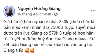Ngay sau bài viết "bóc giá", Hương Giang có phản hồi: Cho rằng mức giá combo 3 tuýp 600k rẻ hơn thị trường (khoảng 750k) và mong người mua không hủy đơn.