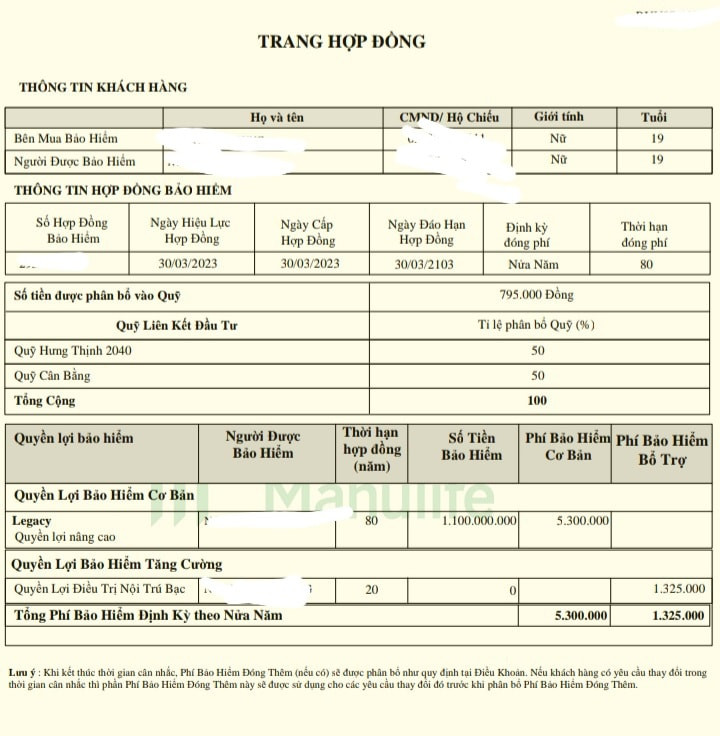“Em đang không biết có nên hủy hợp đồng Manulife Legacy hay không vì thời hạn bảo hiểm, thời hạn đóng phí lên tới 80 năm, tức là mình phải đóng tiền bảo hiểm 80 năm? Trong khi đó chị tư vấn viên nói thời hạn hợp đồng, thời hạn đóng phí và thời hạn bảo hiểm là 20 năm và 20 năm sau em có thể rút tiền hoàn cả gốc lẫn lãi”, cô gái trẻ này băn khoăn.