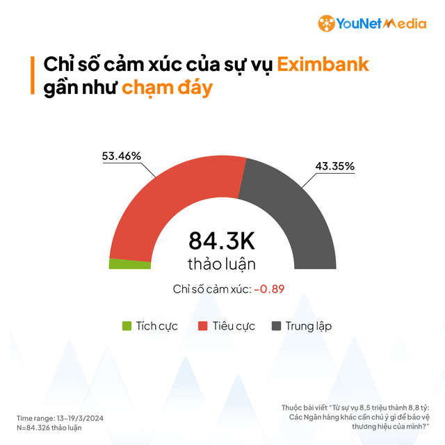Trong 84.300 thảo luận YouNet Media thu thập được từ sự vụ này (tính từ 13-19/3/2024), có đến 45.100 thảo luận công khai chỉ trích sự vụ và ngân hàng Eximbank, chiếm đến 53,46% tổng thảo luận. Chỉ số cảm xúc của toàn bộ sự vụ được ghi nhận ở mức -0,89 (cao nhất là 1, thấp nhất là -1) – tức là gần như chạm đáy.