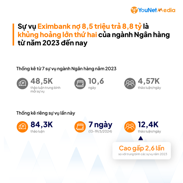 Theo Báo cáo đo lường sự vụ khủng hoảng trên mạng xã hội và tin tức online 2022-2023 từ nền tảng YouNet Media, so với thảo luận phát sinh trung bình/ngày ở các sự vụ tin tiêu cực ngành Ngân hàng năm 2023, sự vụ "nợ 8,5 triệu trả 8,8 tỷ" của Eximbank có lượng thảo luận trung bình/ngày cao hơn 2,6 lần.
