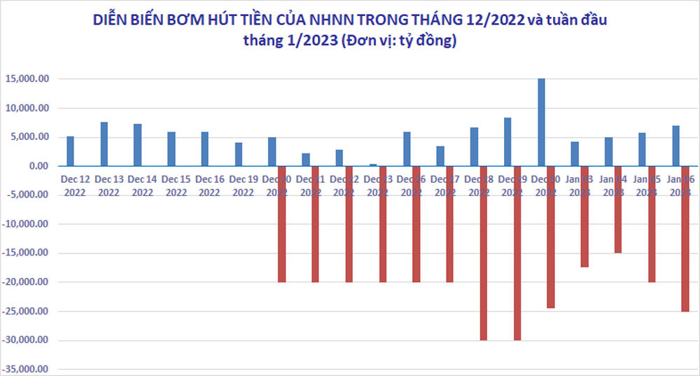 Đây là thuần thứ 3 liên tiếp, NHNN hút ròng mạnh tiền từ hệ thống về. Trong tuần cuối năm 2022 - từ 26-30/12 NHNN đã hút ròng từ thị trường hơn 102.633 tỷ đồng. Trong tuần trước đó, từ 19-23/12 NHNN đã hút ròng từ thị trường gần 94.034 tỷ đồng.