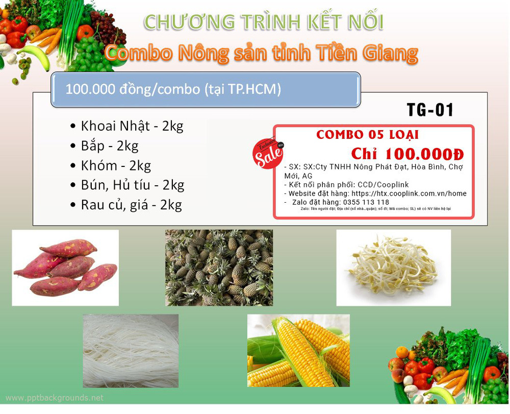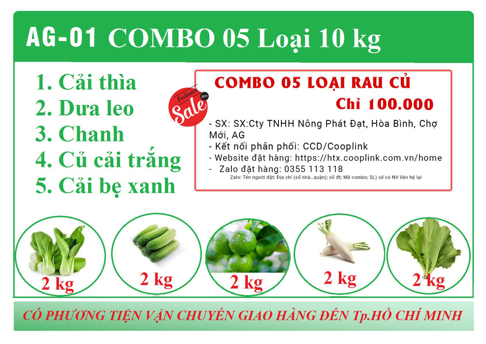 Đây là combo giá rẻ, vì các mặt hàng nông sản được chọn là những loại mà nông dân gặp khó khăn trong tiêu thụ do ảnh hưởng dịch Covid-19. Đa số là hàng hóa dễ vận chuyển, ít hư hỏng như khoai lang, khoai môn, mướp, đậu bắp, dưa leo, củ cải trắng... và một số loại trái cây ít bị hỏng khi vận chuyển.