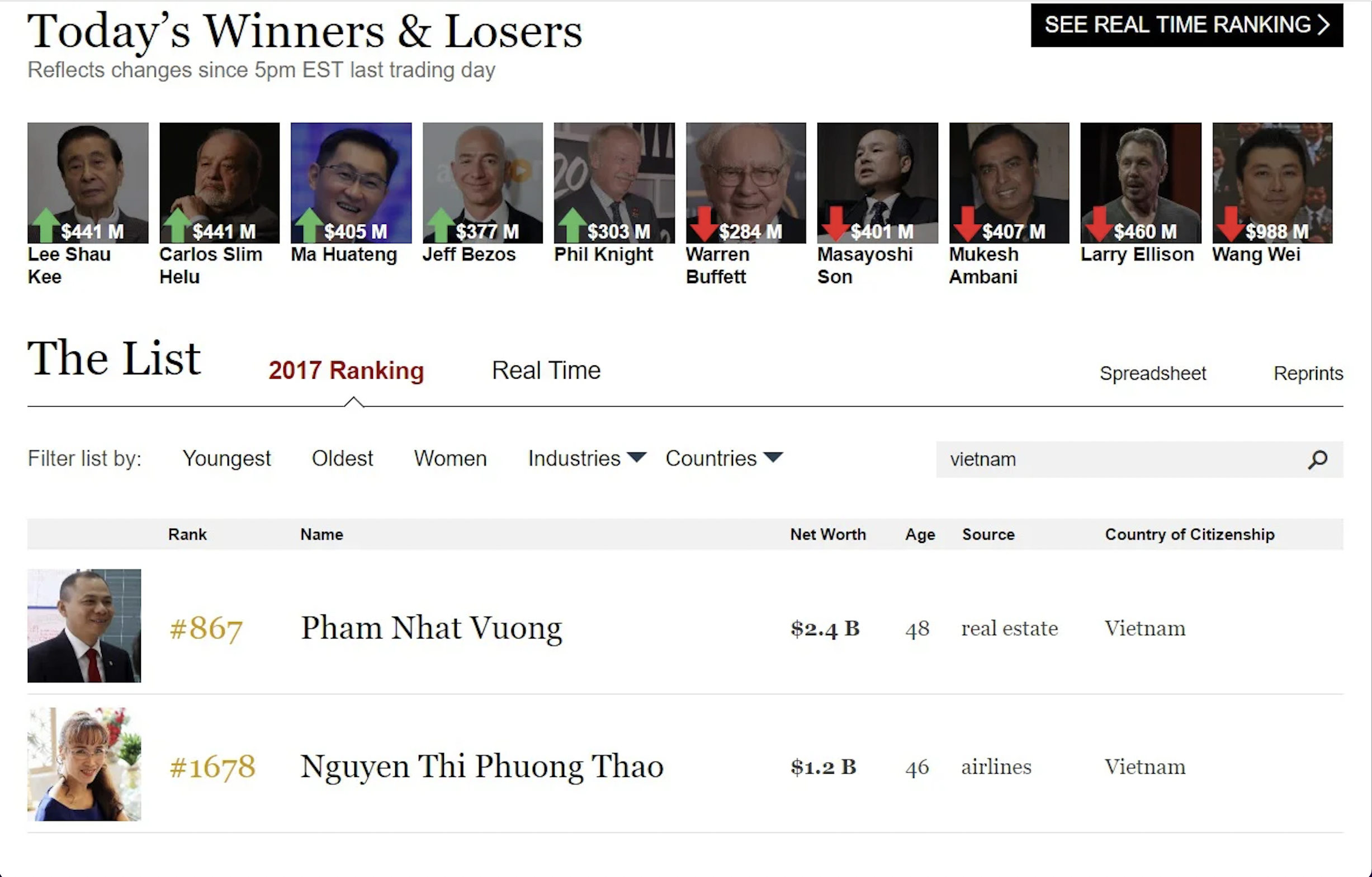 Theo danh sách tỉ phú USD năm 2017 của tạp chí Forbes công bố, Việt Nam ghi nhận 2 tỉ phú USD thế giới, đó là ông Phạm Nhật Vượng - Chủ tịch HĐQT Tập đoàn Vingroup (2,4 tỉ USD) và bà Nguyễn Thị Phương Thảo - Tổng Giám đốc Vietjet Air (1,2 tỉ USD).